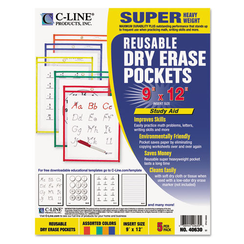 Reusable Dry Erase Pockets, 9 X 12, Assorted Primary Colors, 5-pack